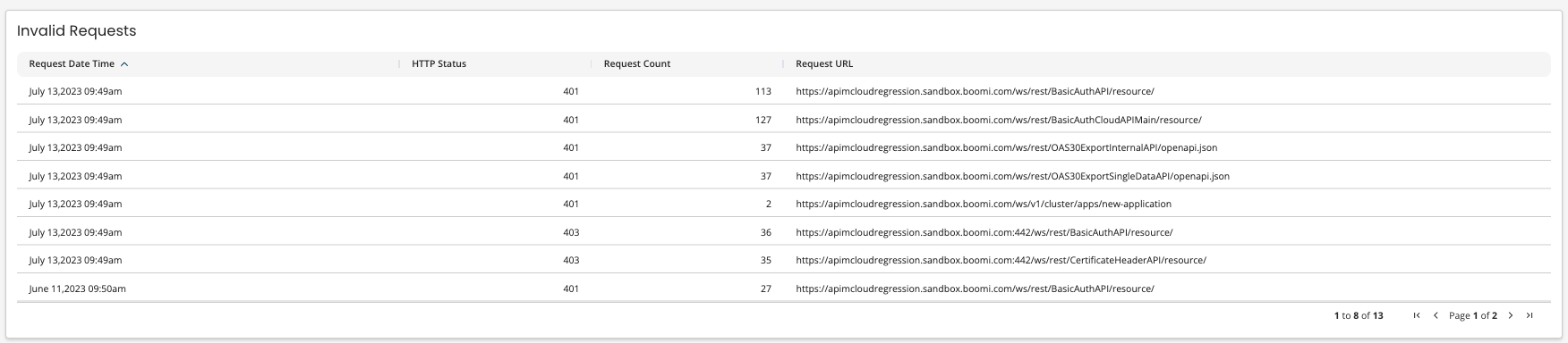 The table displays the HTTP Status, Request Count, Request URL, and the Request Date Time for invalid requests.