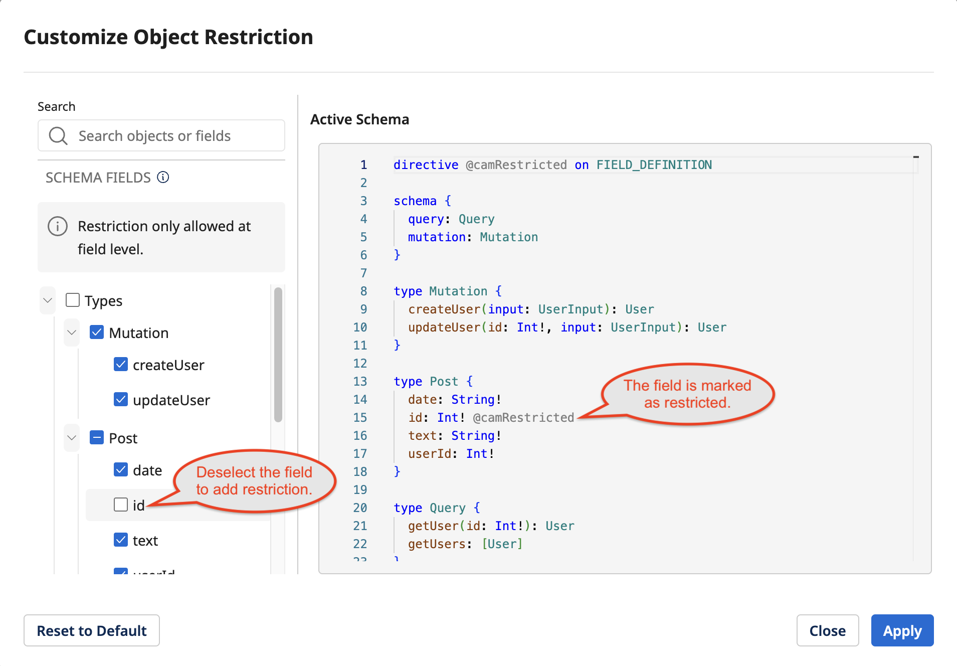 - To restrict schema fields, deselect an object field on the left side of the Active Schema. The corresponding object will be marked restricted in the Active Schema file.