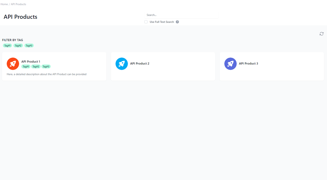 In the center on top, there is a search bar that offers a search functionality, along with a checkbox for "Use Full Text Search." This option allows users to expand their search criteria to include more comprehensive data within the API product descriptions, which can be beneficial when managing a large catalog of API products.