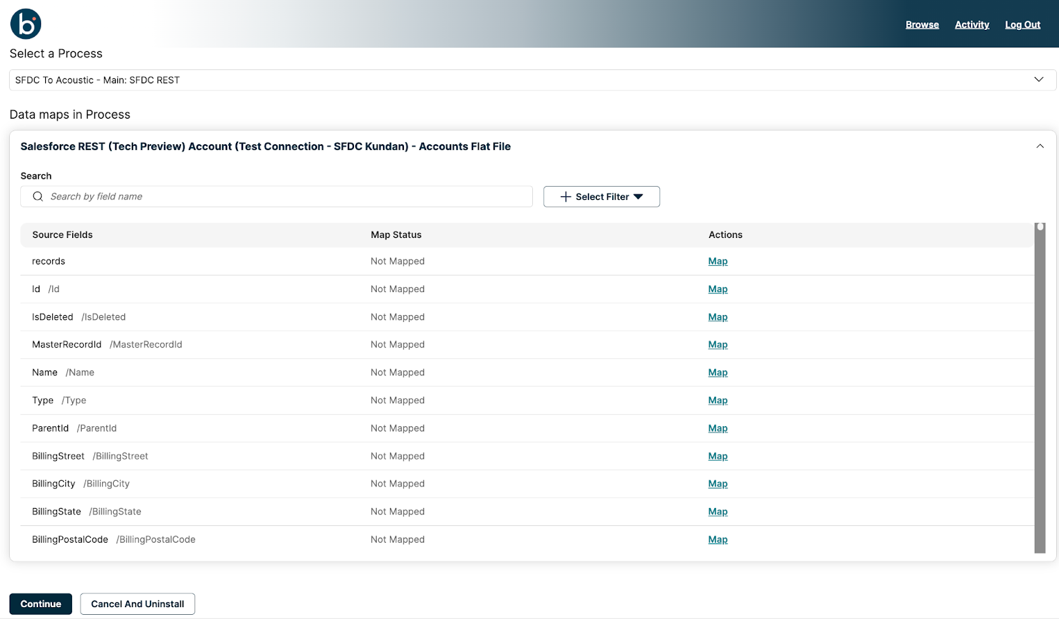 Data maps allow you to map additional fields for integration. While the admin preconfigures this during process creation, you can update or modify the mapping configuration as per your requirements. The Data maps table displays the Source Fields, Map Status, and Actions for each data field.