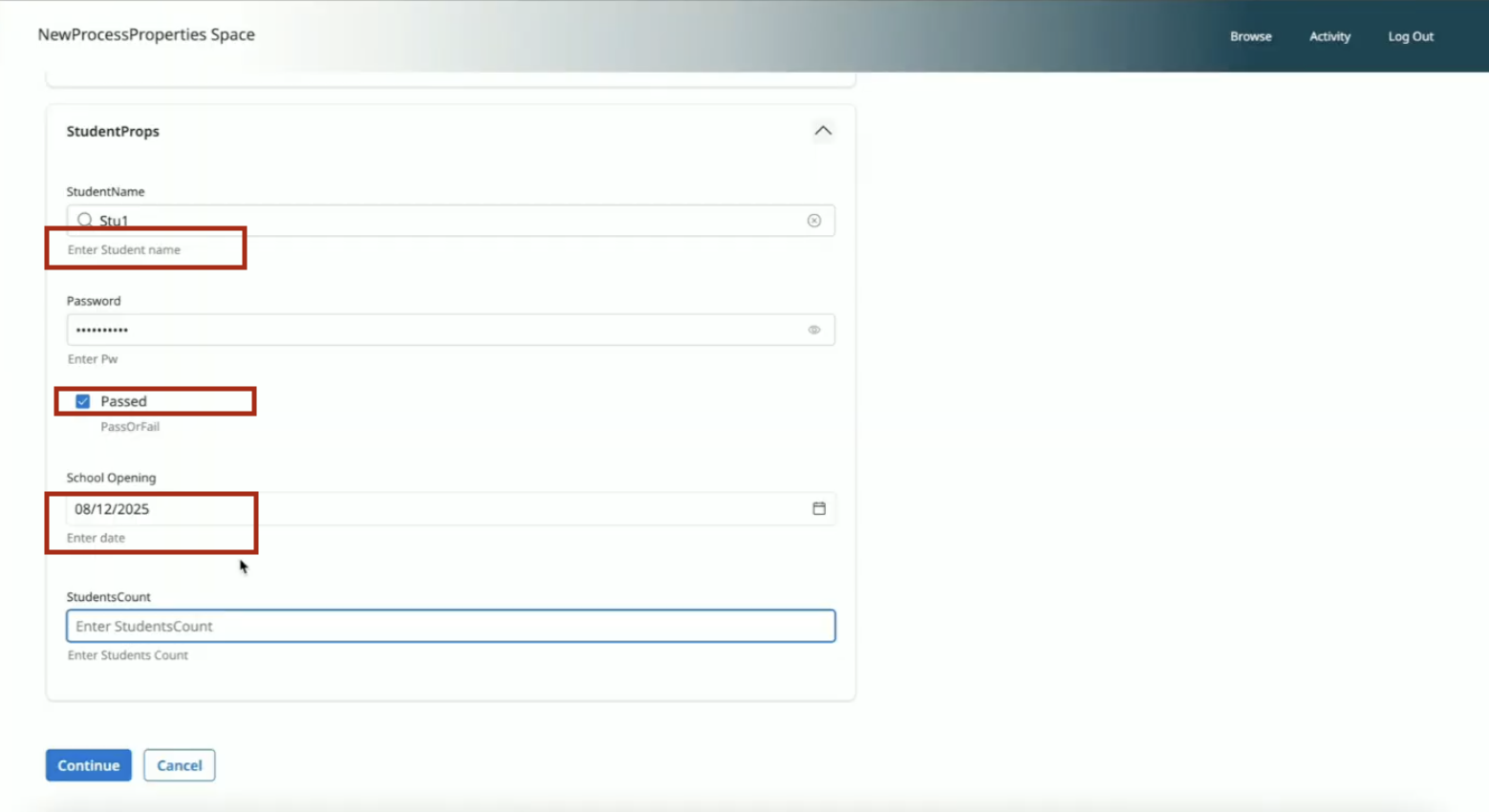 Process Properties provides consumers a more customized experience while installing a Spaces solution. When running a process with process properties variables (as inputs), based on the datatype configured by your admin for any field, you can use: