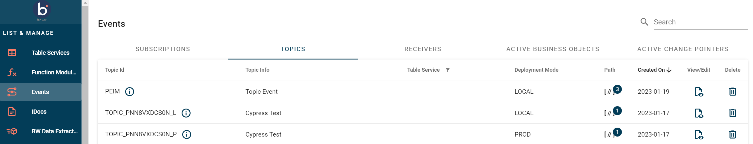 Once you create your subscription, you can view all the event components you have created under List and Manage. From this page, you can edit or delete the Receiver, Subscription, and Topic.