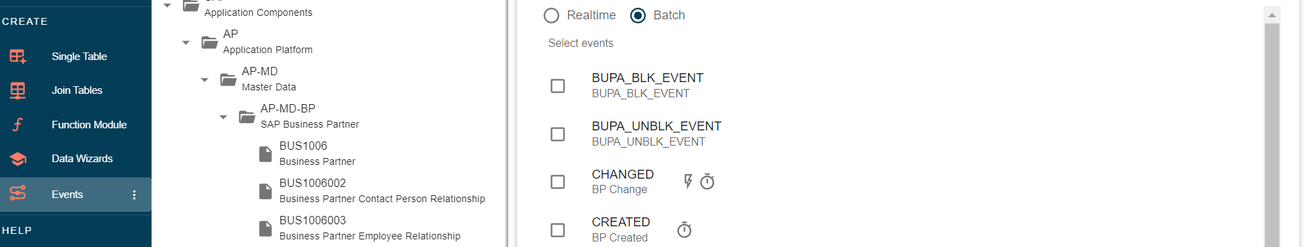 The symbols indicate if the event has already been in the SAP backend. The lightning symbol indicates it is ready for real-time processing, while the stopwatch symbol indicates it is ready for batch processing. You can still create your subscription even if the event hasn't been implemented in the SAP backend. This can be done after finalizing the subscription.