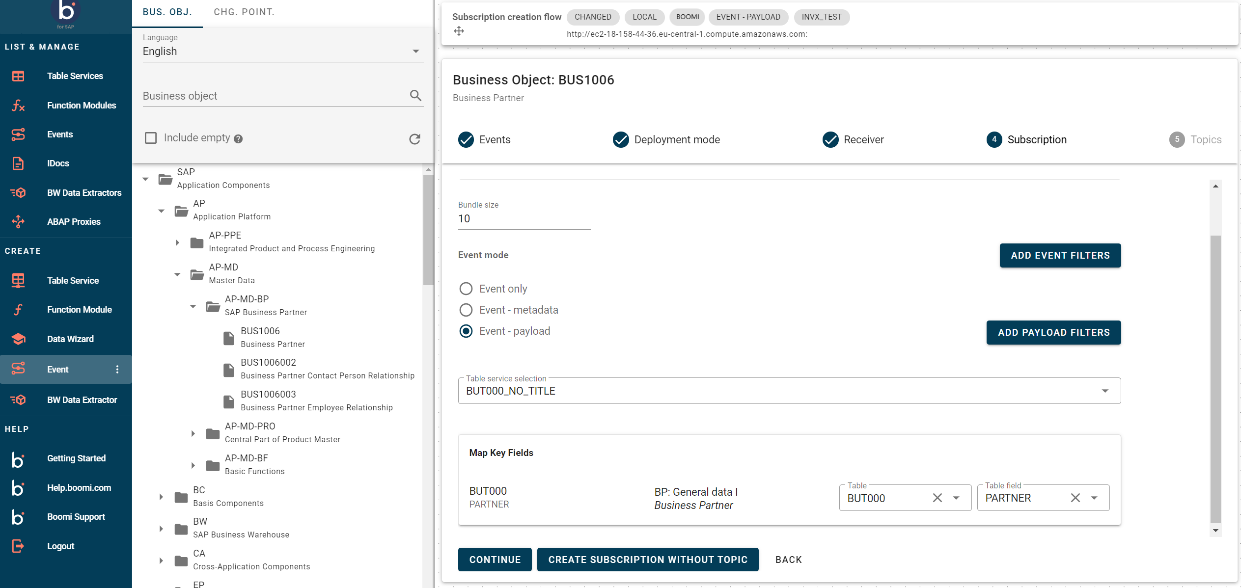 Adding Event Filters: You can add event filters that uses metadata from the event itself to determine if the event should be handled. These filters can examine the table key(s) in change pointer events or the fields from a business object event. Learn more about how Boomi for SAP manages Buisness Object Event and Payload Filtering.