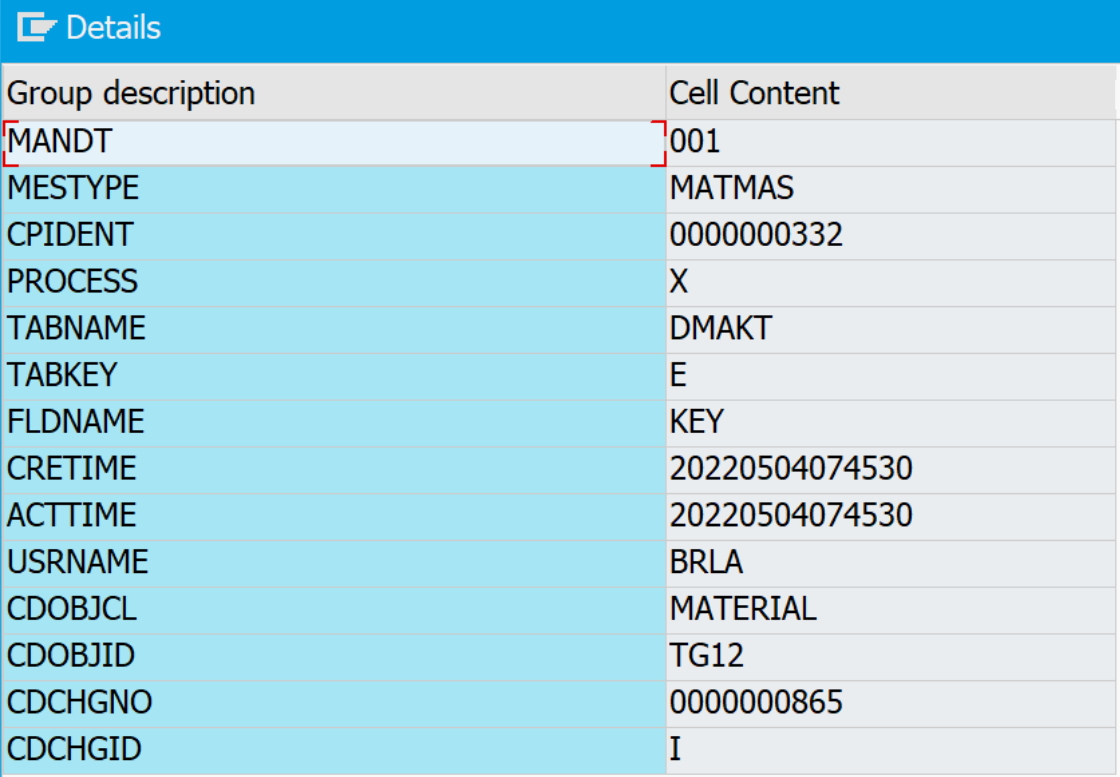In the case of our BDCP2 example data mentioned above, the where clause input will be converted to: MARAMATNR = 'TG12' AND MAKTSPRAS = 'E'. This example demonstrates the need to use both the Change object key and the Table key to retrieve the correct table entry in the MAKT database table.