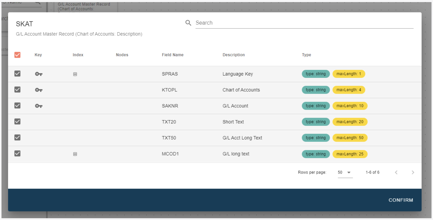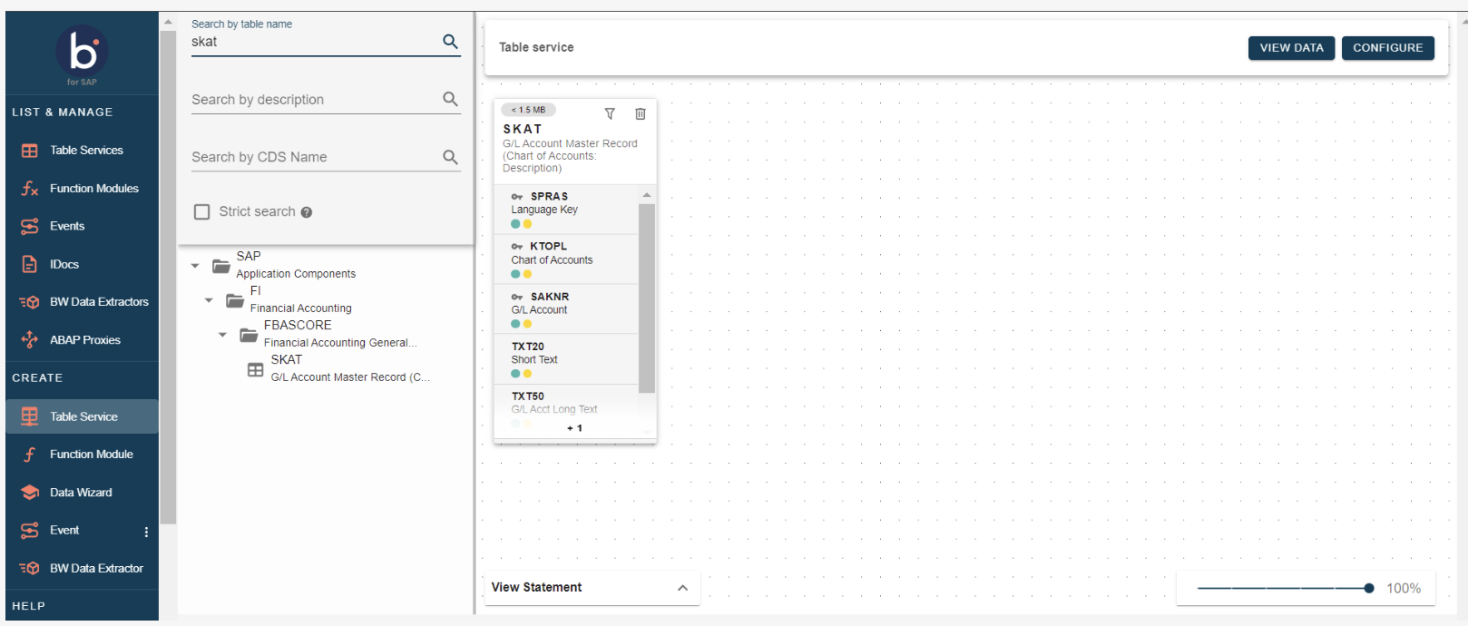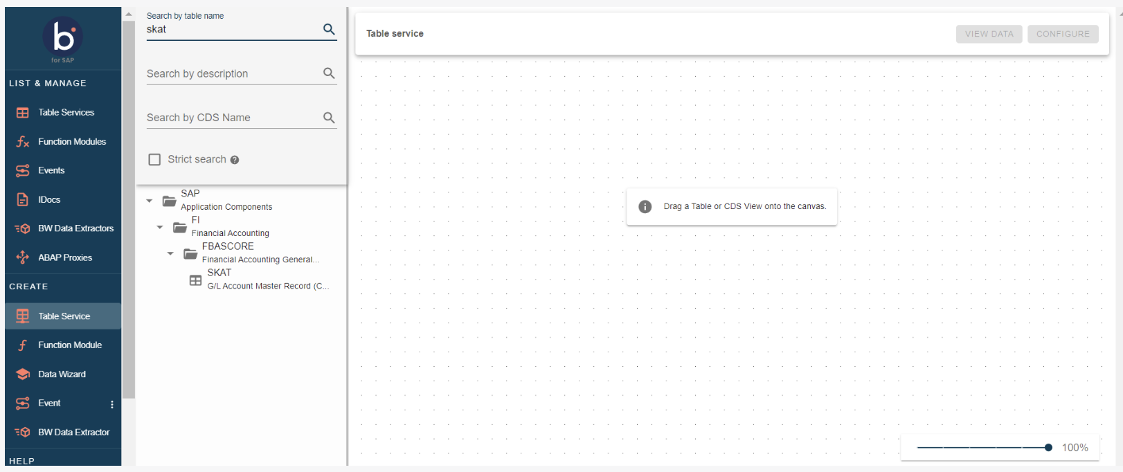 Use the Search Table or the Table Wizard to search for your desired table. For example, if you search for SKAT, all table names containing that word will appear.