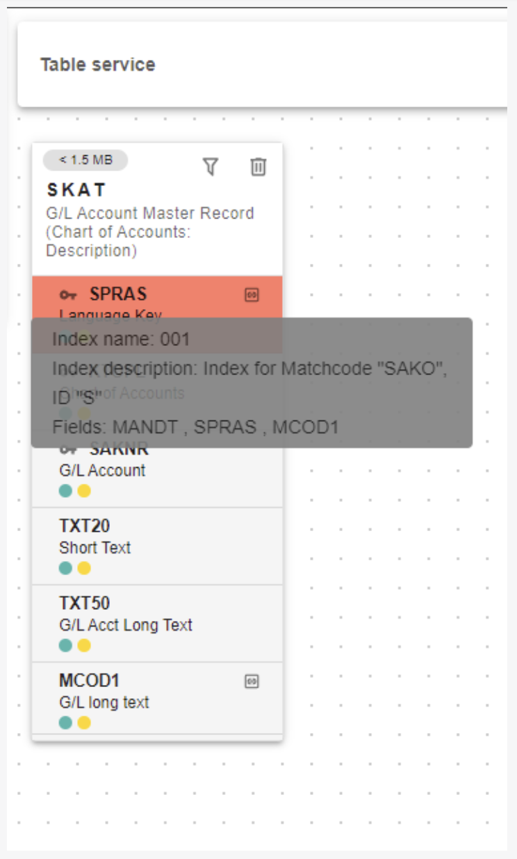 To view information on available fields for your table, hover over the index sign. To delete a table from the canvas click the garbage can icon in the upper right corner of an individual table.