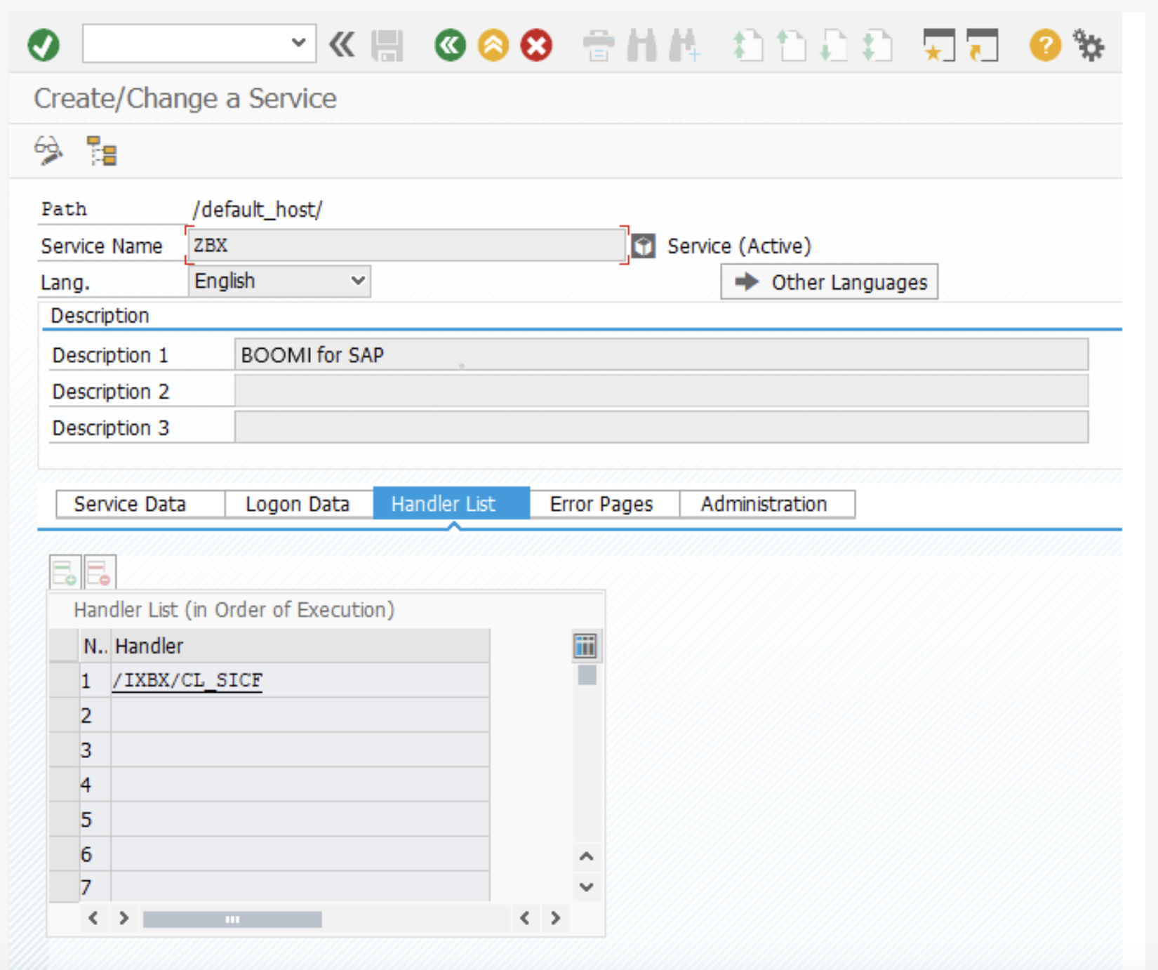 - Enter Boomi for SAP as Description 1. Enter handler class /IXBX/CL_SICF in the Handler List tab.