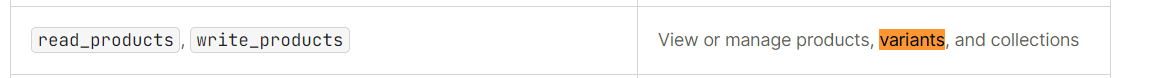 - To pull the variants report, you need the read_products report (Variants are highlighted in the image).