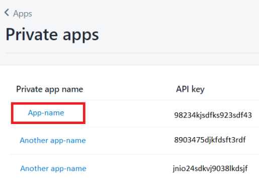 - Navigate to the Shopify menu, click Apps, and click Manage Private Apps at the bottom of the page to view the following details.
