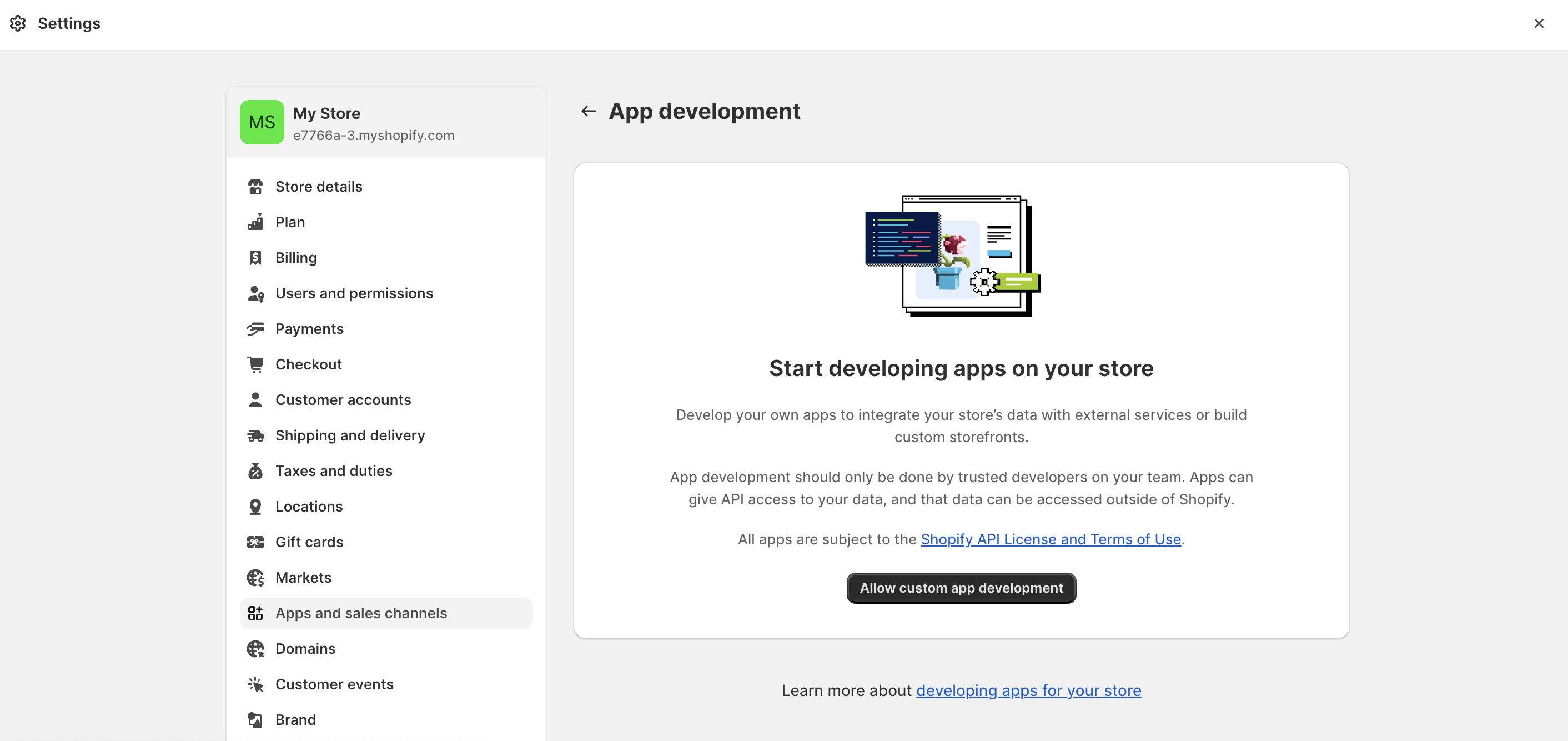 Shopify offers token-based access for custom apps. To begin, you need an admin account and enable custom app development.