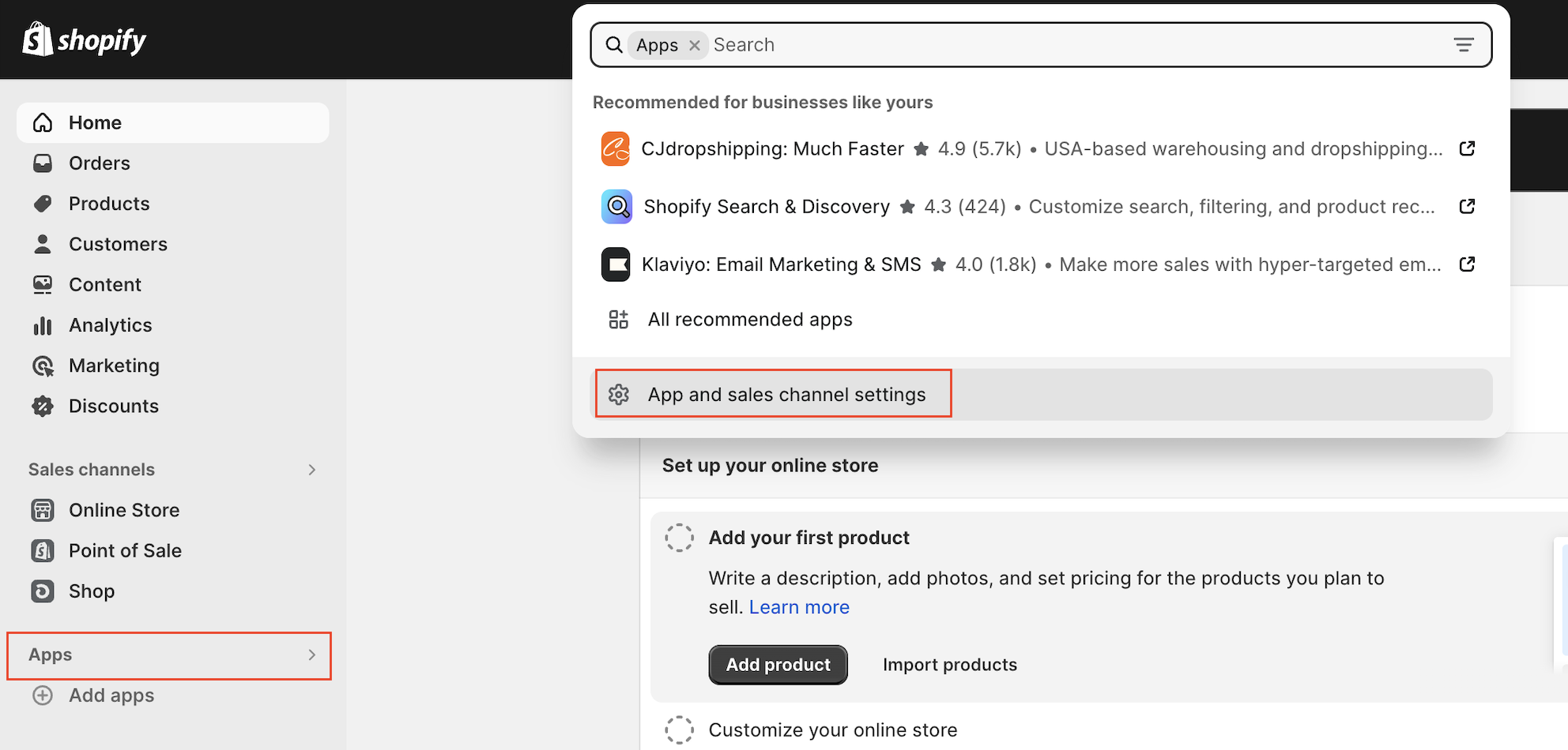 - From your Shopify Admin, click Settings > Apps and sales channels.