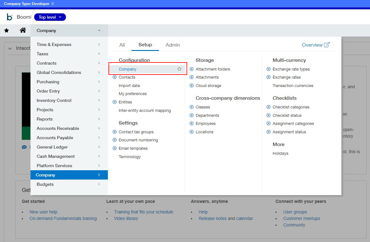 The Intacct connection represents and contains all of the information to connect and sign in to Intacct's On-Demand Financial Application Suite. You need a separate connection for each Company ID.
