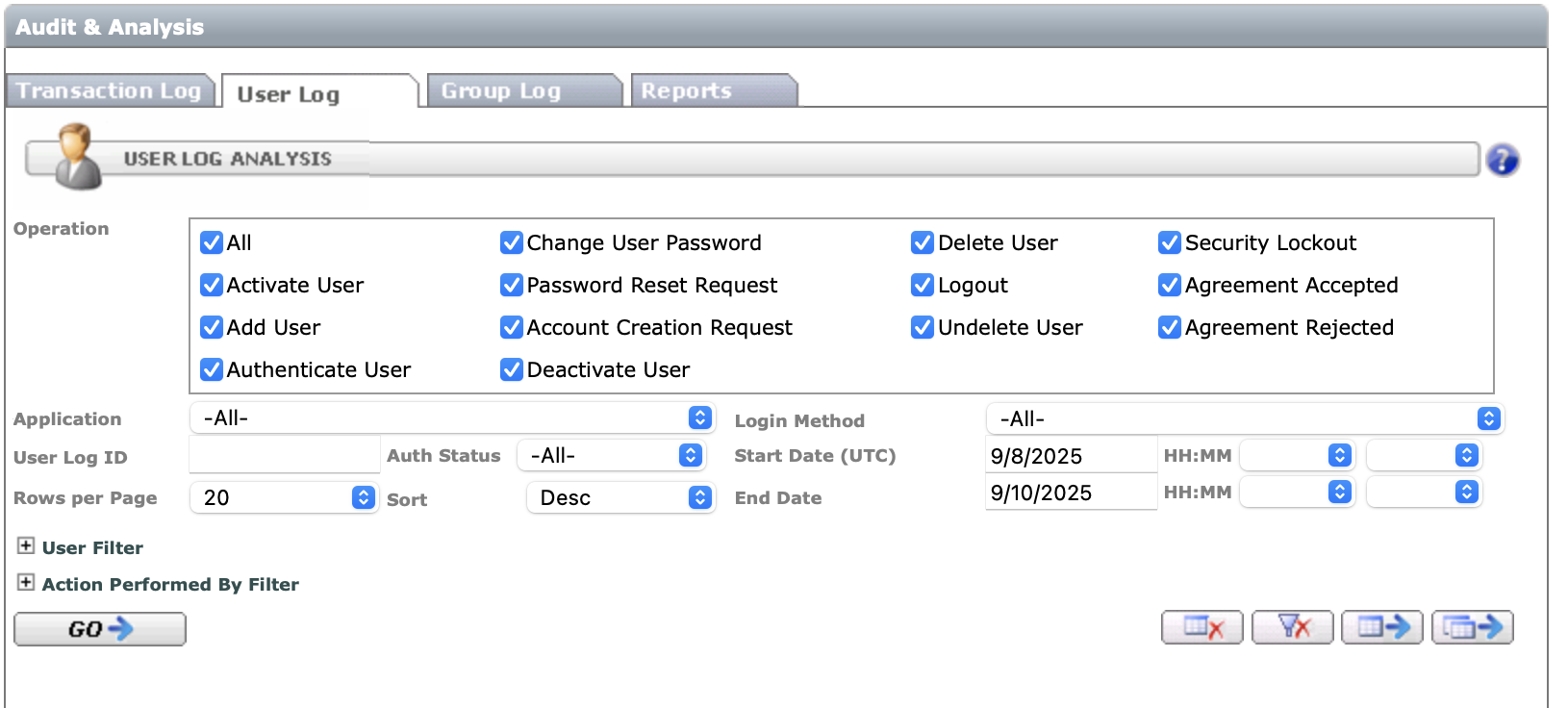 You can filter by an ID to access a log entry directly. - Operation Date/Time (UTC) – Operation creation date range.