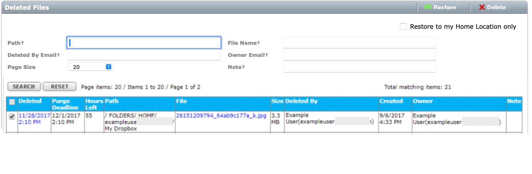 All deleted files that are deleted manually or by the retention service are available the DELETED FILES in the Administration Web portal. Deleted files are kept in the "Deleted File folder" for the period set in the "Site Options" under "File System Purge Period".