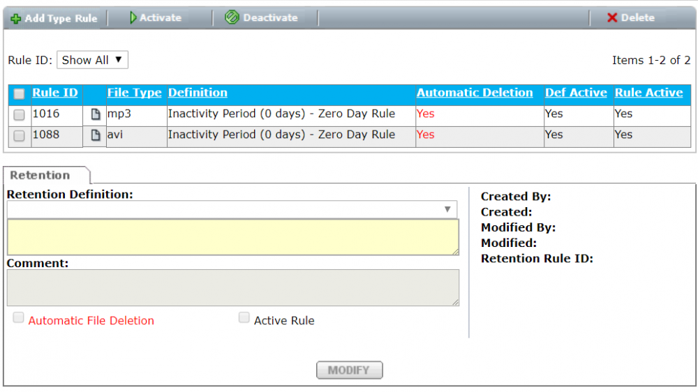 - Configure the rule by specifying the file type(s), retention policy, and whether automatic deletion enabled.