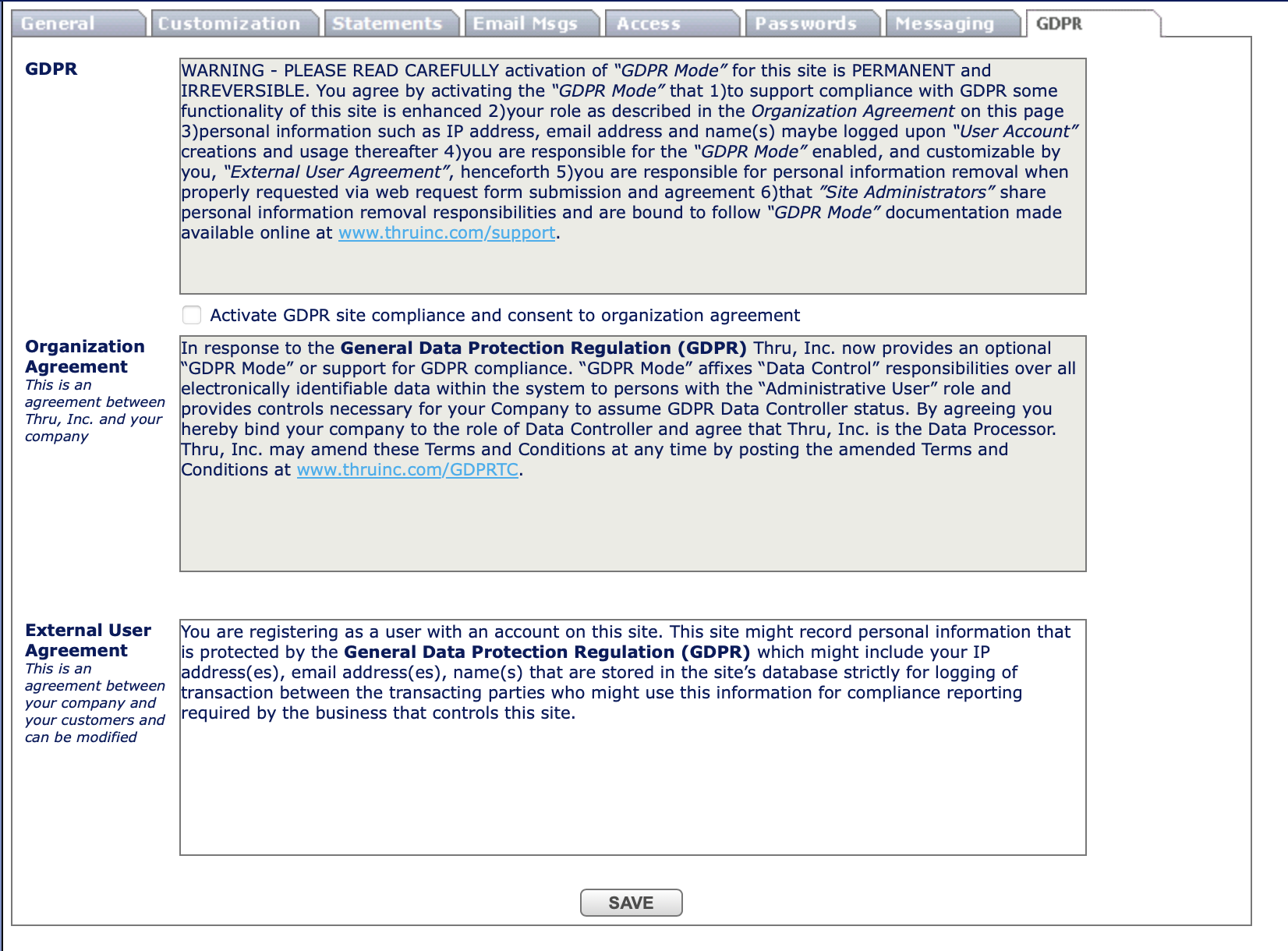 The GDPR tab is visible in the Administrative UI in the Site Options > GDPR