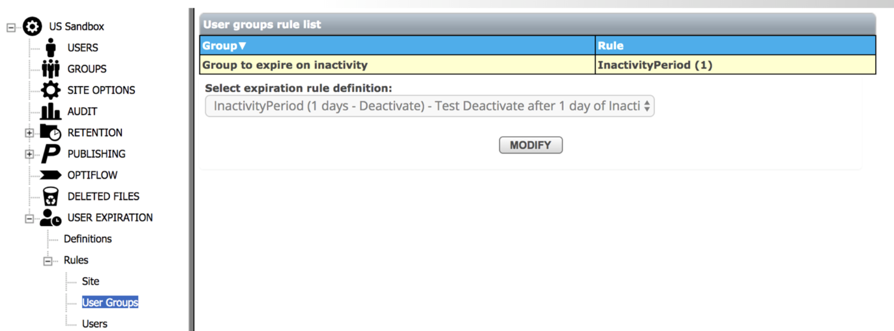 User Group rules are listed under "Administration->User Expiration->Rules->User Groups," where administrators can view and manage the rules: