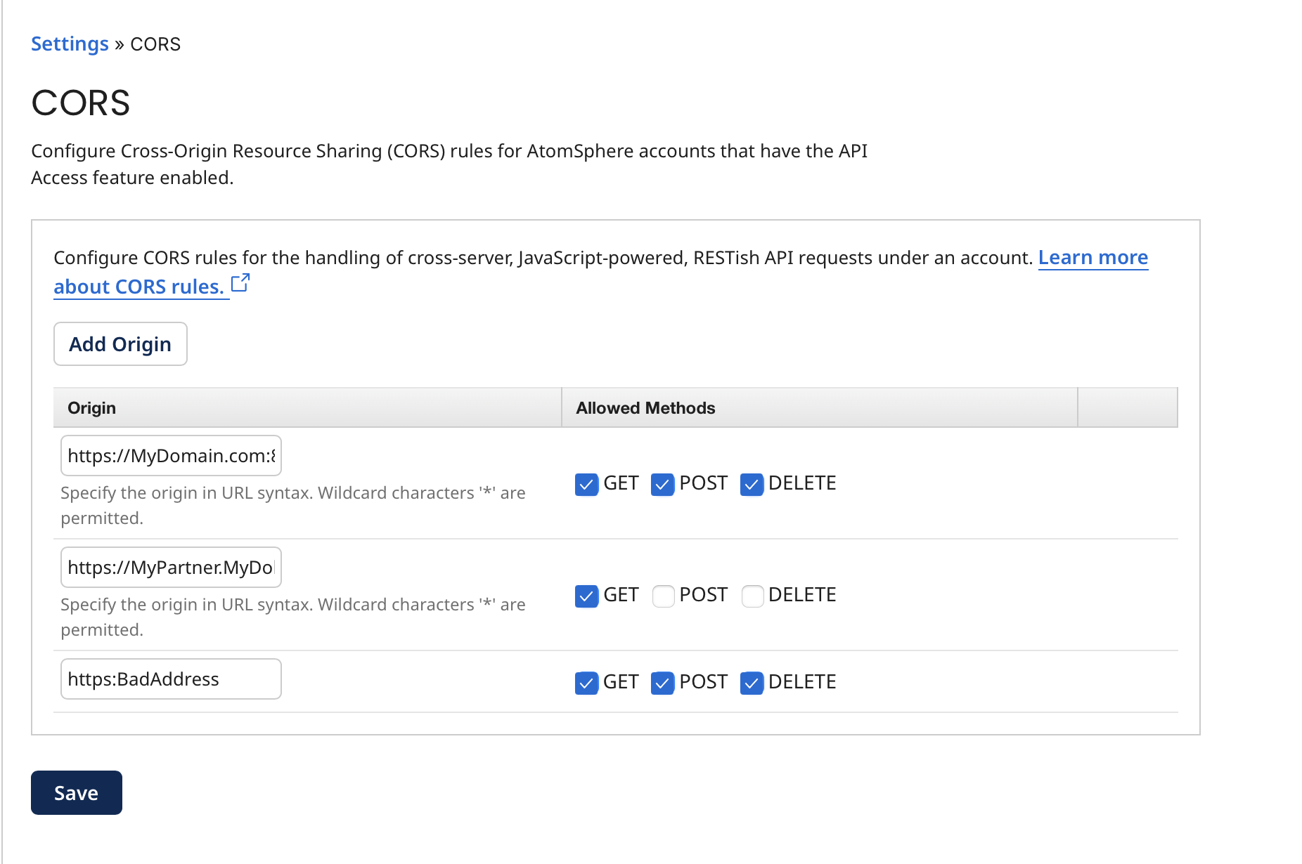 To enable CORS requests under a account, you must configure CORS request matching rules for the account on the CORS page (Settings > Boomi Platform API > CORS). Each rule specifies: